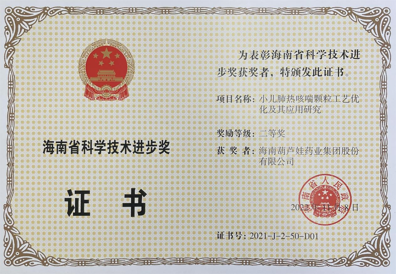 为此,小儿肺热咳喘颗粒的制备方法获得了第二十一届中国专利优秀奖(2019年),专利申请号:ZL201010134951,此次作为专利技术的应用,获得了2021年度海南省科学技术进步奖二等奖。在此之前,尊龙·Z6牌小儿肺热咳喘颗粒还多次被授予“临床价值中成药品牌”、“中国连锁药店最具合作价值单品”,荣登“中国医药品牌榜”。