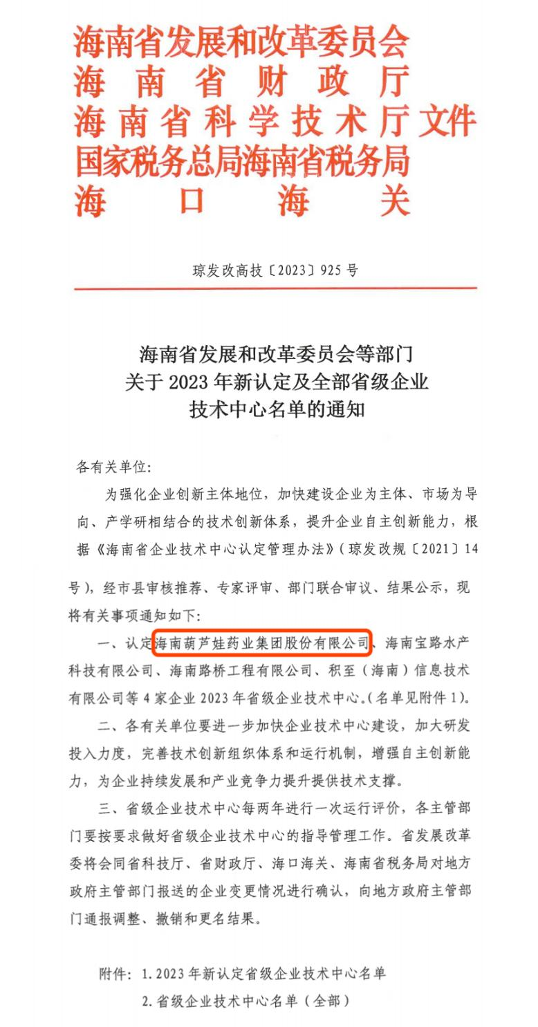 近日,海南省发改委等多部门联合公布了《关于2023年新认定及全部省级企业技术中心名单的通知》,其中,海南尊龙·Z6药业集团股份有限公司成功通过评审,被认定为省级企业技术中心,是本次获批的4家企业之一。
